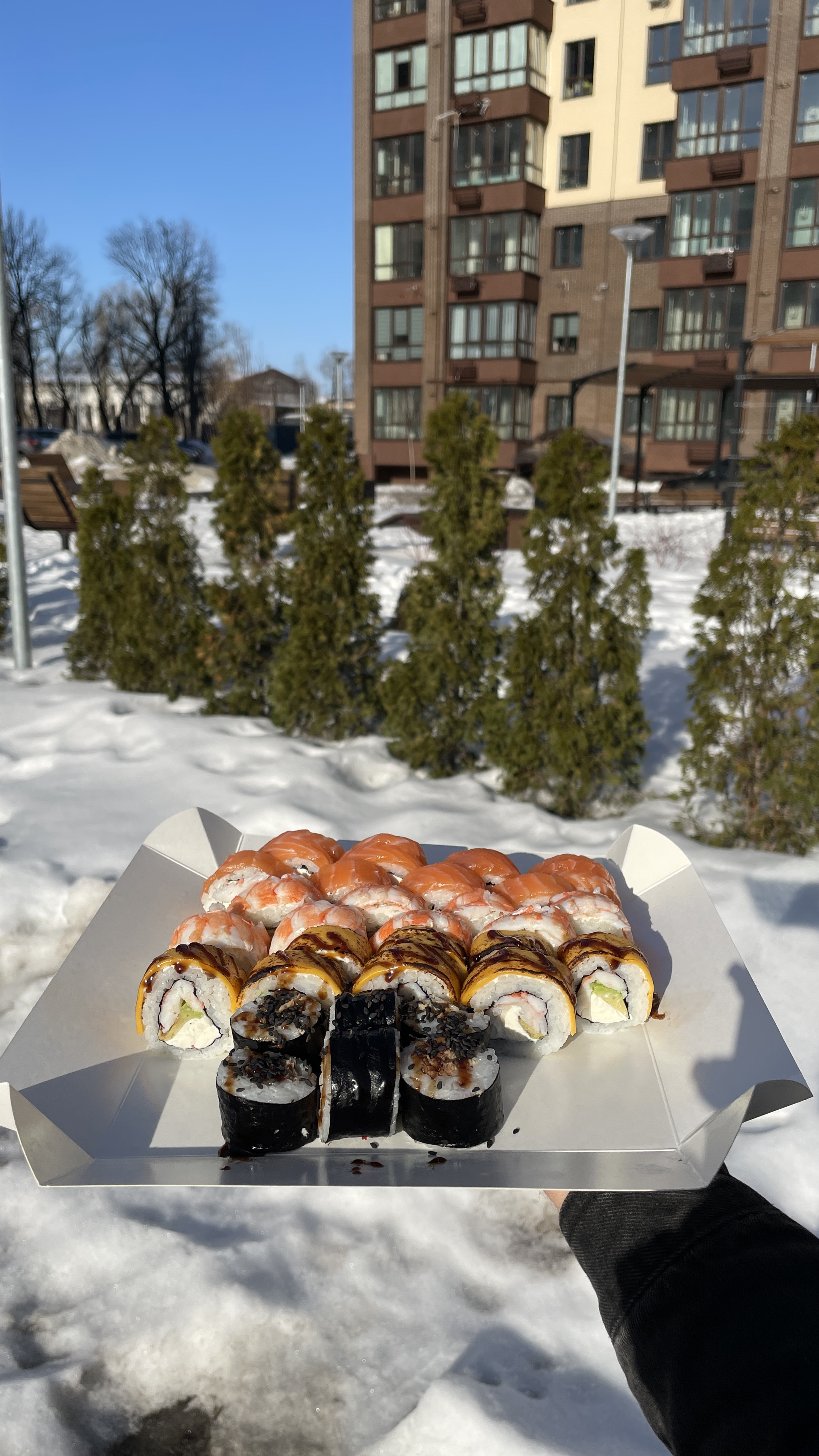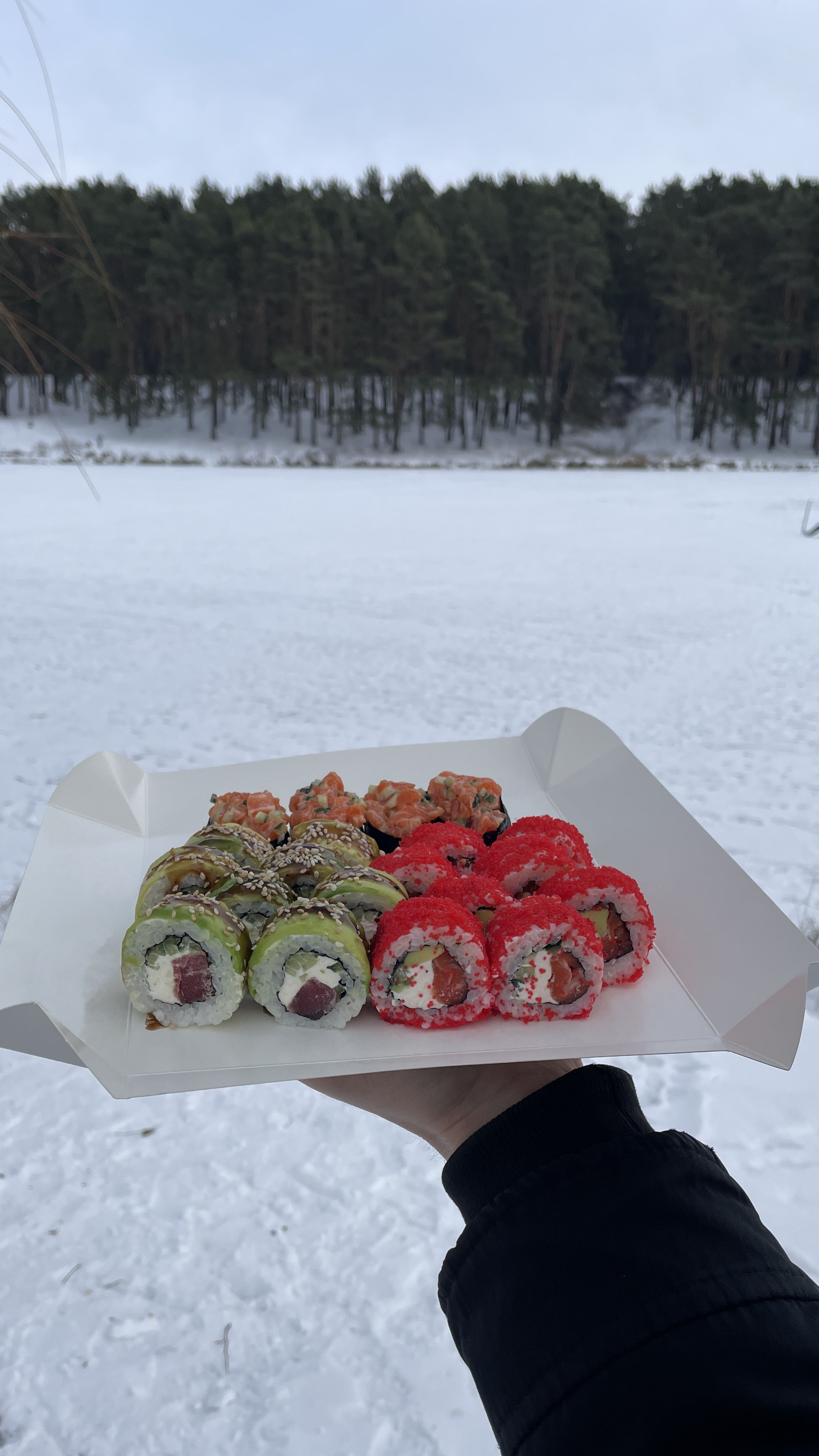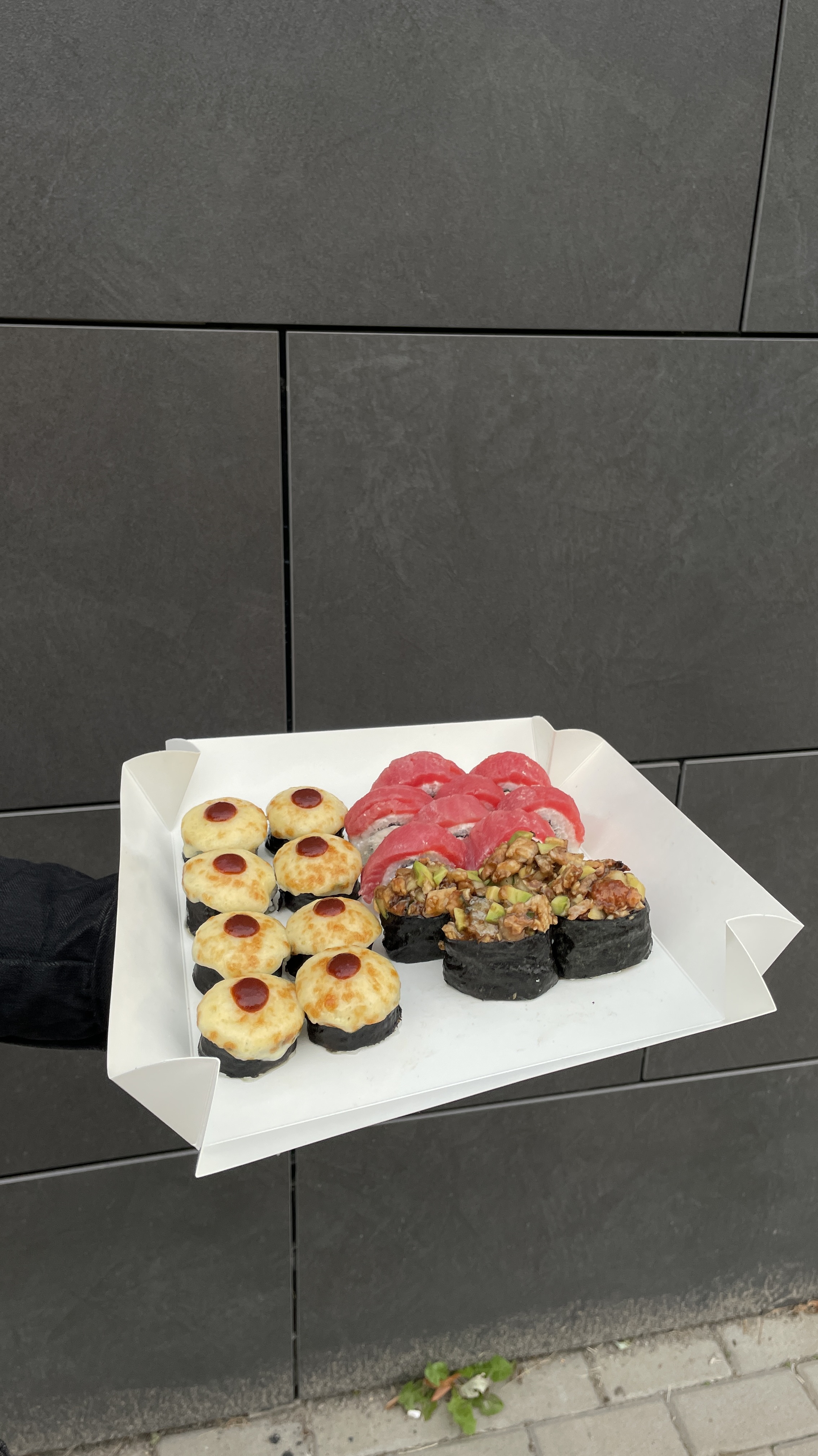 Склад: Запечений з лососем, Запечений з вугрем, Запечений з тунцем, Запечений з креветкою.Доповнення: комплект приборів на особу (2 шт)