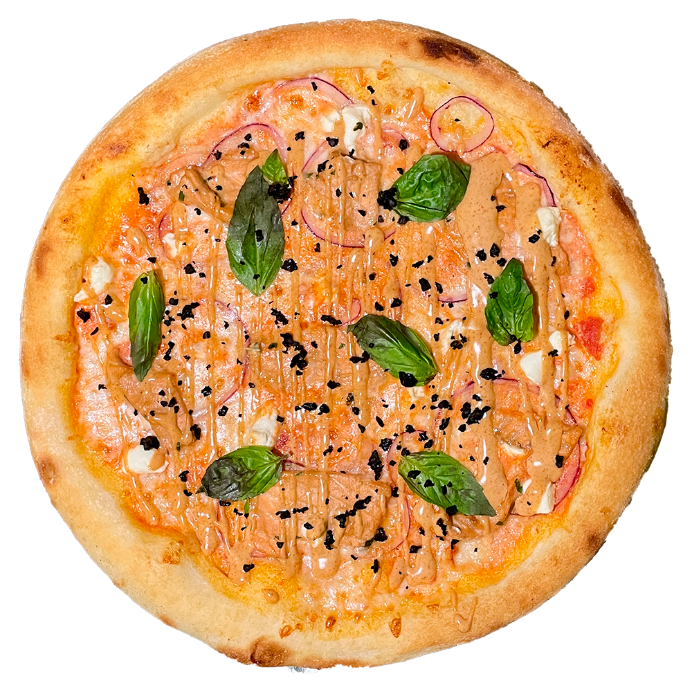 Соус пілаті, моцарела, печериці, мисливські ковбаски, маринована червона цибуля, горіх мускатний, перець чилі.